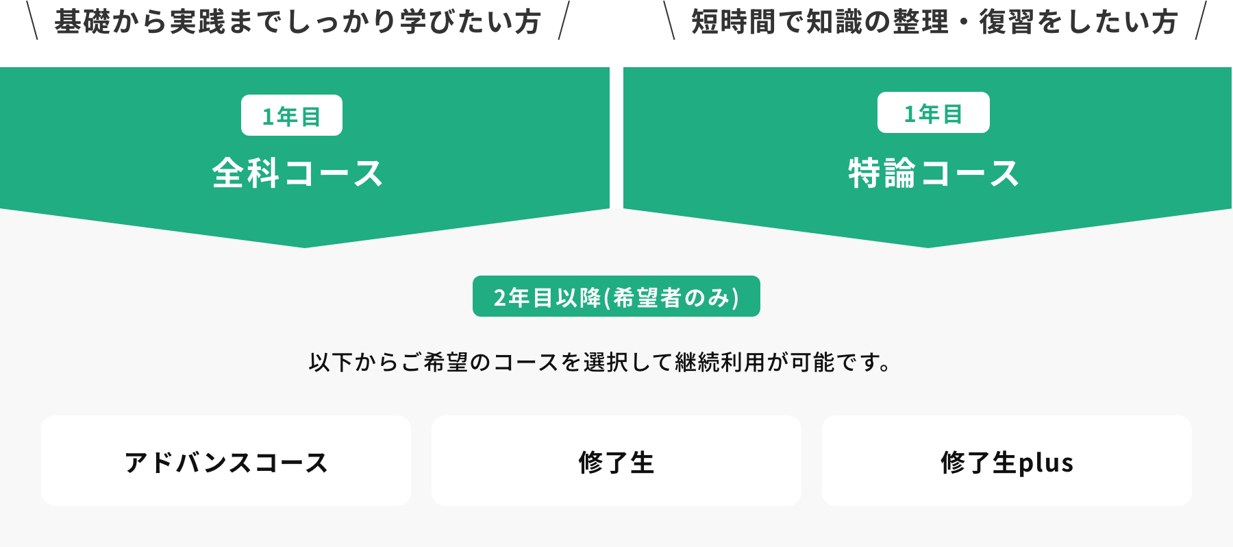 | 修了生Plus | これまで受講したコンテンツの継続視聴 個別指導、勉強会の参加 |