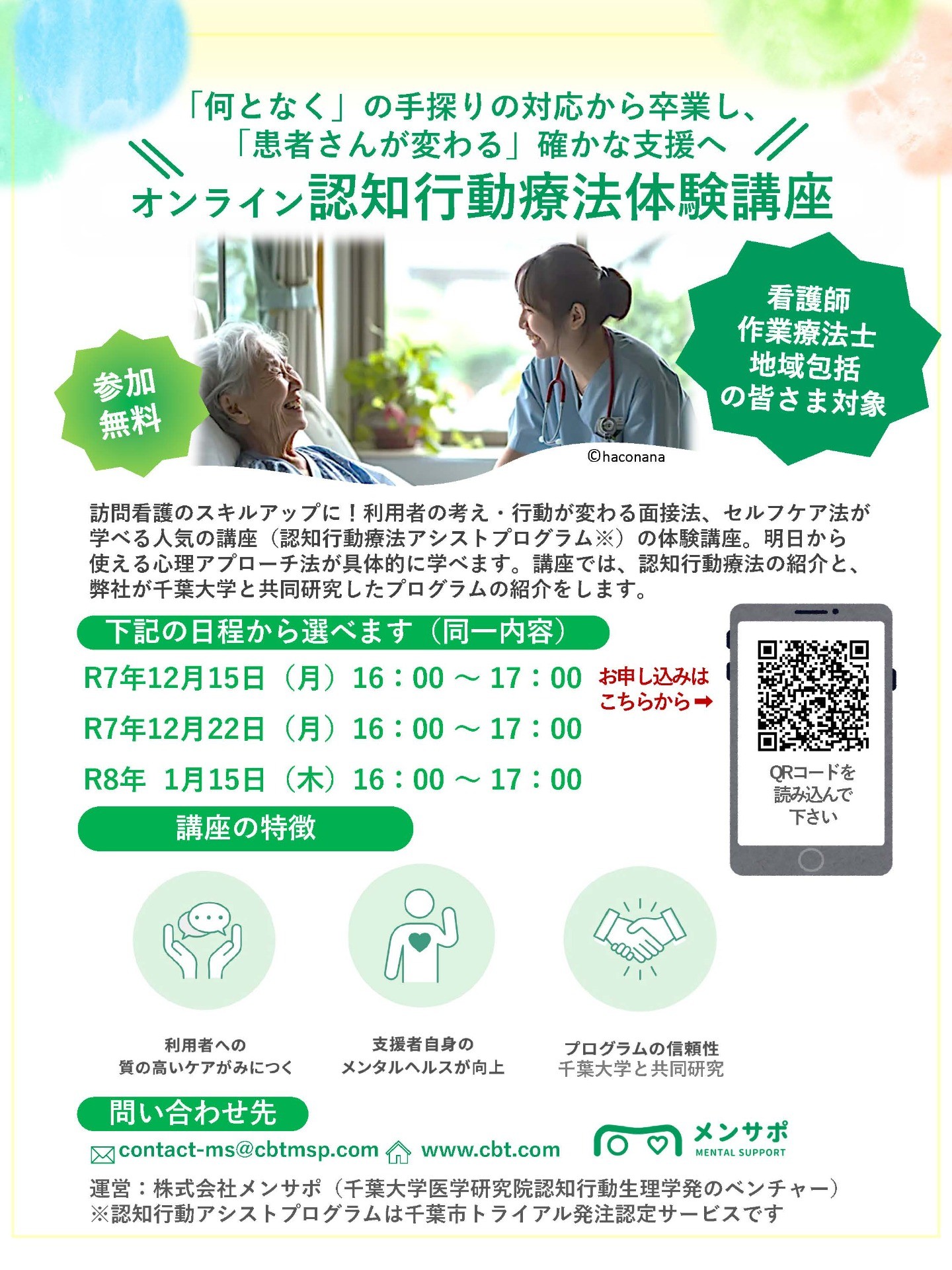 2023年度より千葉⼤学発ベンチャー「株式会社メンサポ」が千葉大学のメンタルサポート医療人教育⽀援事業を引き継ぎました。